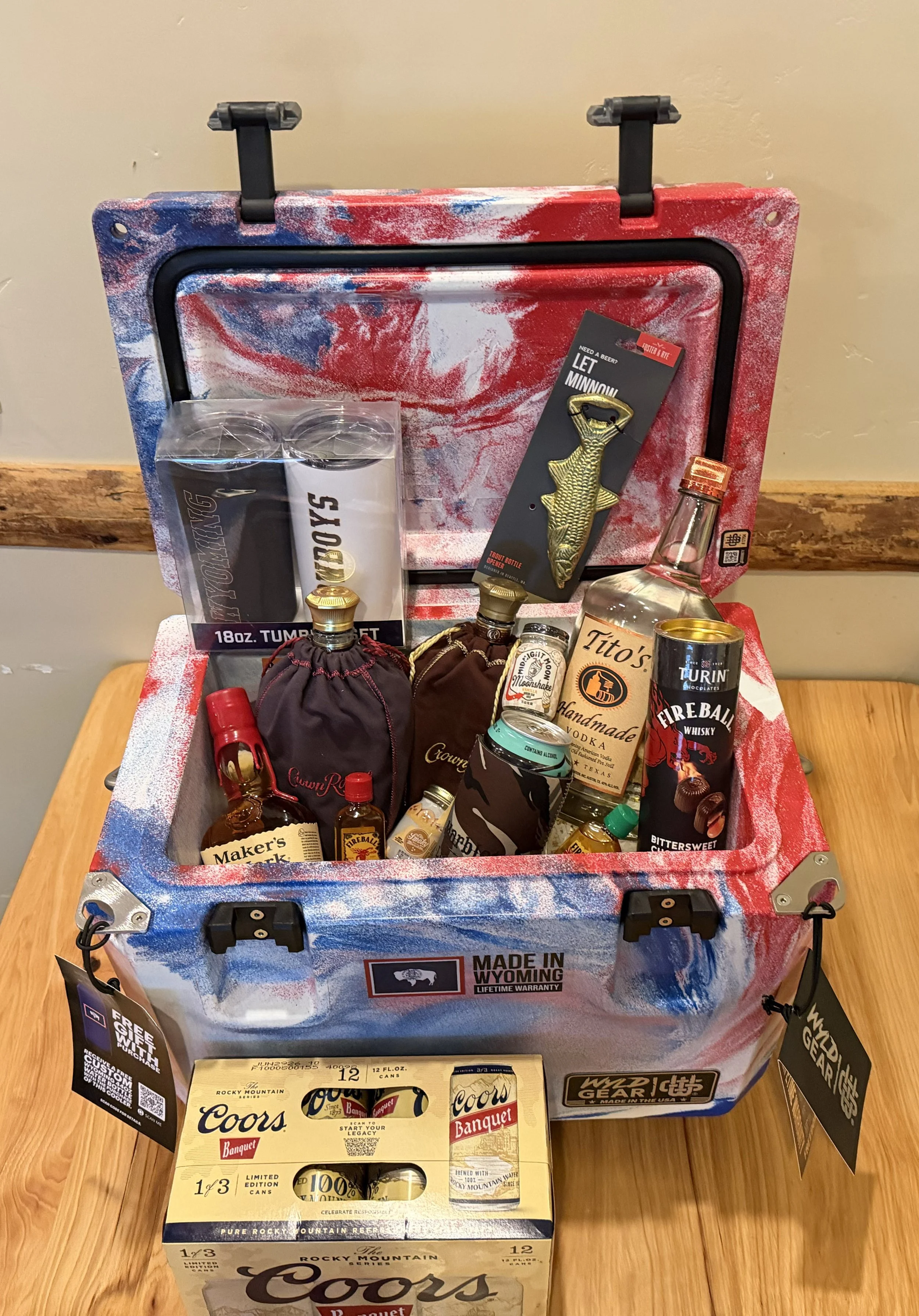 A special Wyoming made WYLD Gear cooler full of assorted alcohol and goodies.